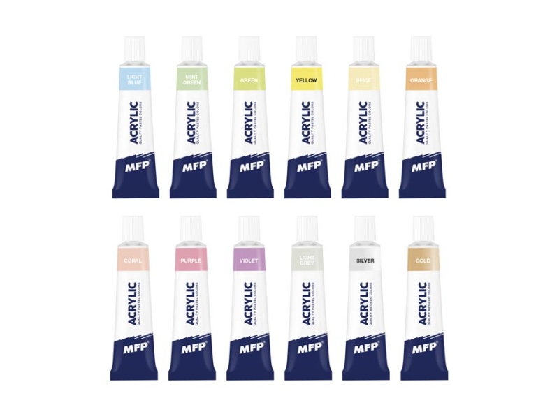 Akrilové farby sú vodou riediteľné a po zaschnutí vode odolné. Vyznačujú sa svojou farebnou sýtosťou a stálosťou, jemnou a hladkou konzistenciou a veľmi dobrými krycími schopnosťami. Sú vhodné na všetky nemastné a hladké povrchy, ako je plátno, papier, drevo, kameň ap. Veľkým hitom pre deti i dospelých je aj maľovanie na kamienky. Tejto zábave už prepadli celé rodiny a práve pre ne sú určené tieto farby. Po zaschnutí odporúčame farbu ešte zafixovať akrilovým lakom, ktorý kresbu ochráni. Súprava obsahuje 12 farieb v kovových tubách (10 x pastelová a 2 x metalická farba)