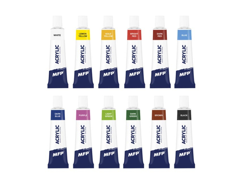 Akrilové farby sú vodou riediteľné a po zaschnutí vode odolné. Vyznačujú sa svojou farebnou sýtosťou i stálosťou, jemnou a hladkou konzistenciou a veľmi dobrými krycími schopnosťami. Sú vhodné na všetky nemastné a hladké povrchy, ako sú plátna, papier, drevo, kameň atď. Veľkým hitom pre deti i dospelých je aj maľovanie na kamienky. Tejto zábave už prepadli celé rodiny a práve pre ne sú tieto farby určené. Po zaschnutí odporúčame farbu ešte zafixovať akrilovým lakom, ktorý kresbu dokonale ochráni. Set obsahuje 12 farieb v kovových tubách. Farby v balení: čierna, ružová, biela, tmavomodrá, svetlomodrá, tmavočervená, svetločervená, ružová, hnedá, tmavozelená, zelená, tmavožltá, svetložltá. Obsah farby v tube: 12 m