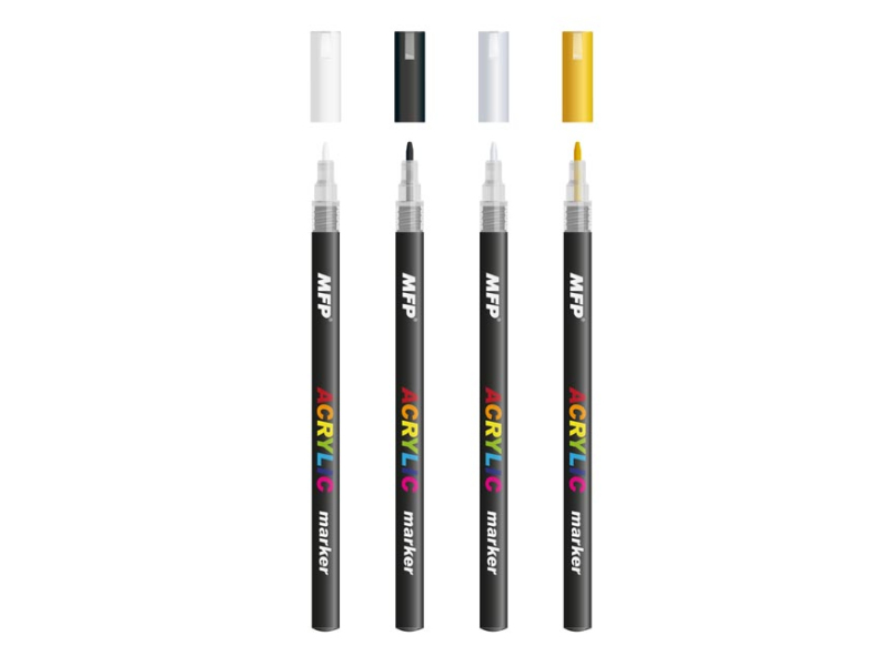Akrylový popisovač, súprava 4 ks balených v plastovej krabičke. Tieto akrylové popisovače sa vyznačujú svojou farebnou sýtosťou a stálosťou, veľmi dobrými krycími schopnosťami. Sú vhodné na všetky nemastné a hladké povrchy ako sú plátna, papier, drevo, kameň a iné. Súprava obsahuje tieto farby: zlatú, striebornú, čiernu a bielu NÁVOD NA POUŽITIE: Pred použitím potraste. Stlačte hrot dole, kým nevytečie farba. Nepritláčajte hrot pri písaní. Skladujte hrotom hore. Hrot: 1 mm Priemer: 11 mm Dĺžka jednej farby : 148 mm Uvedená cena je za 1 súpravu.