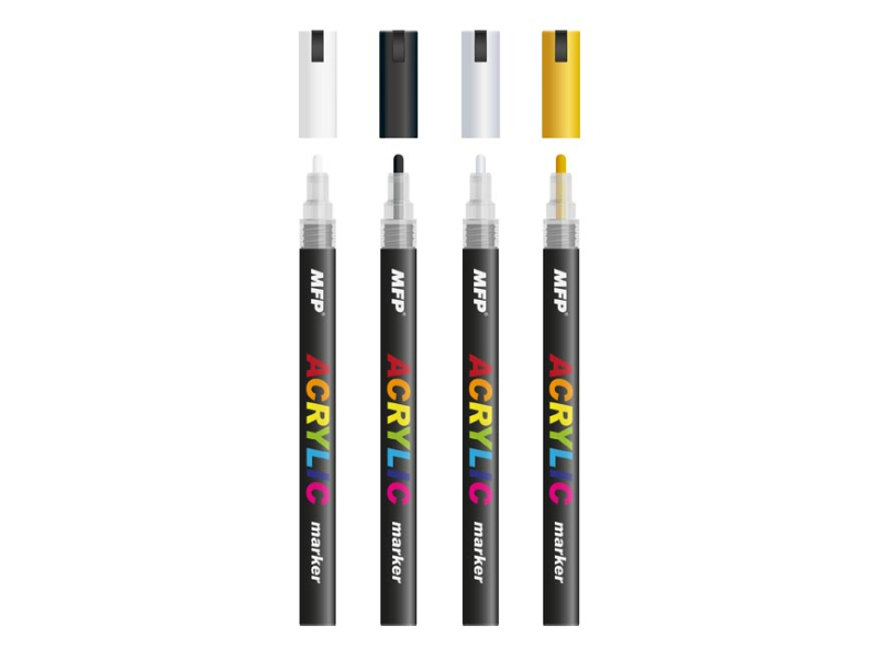 Akrylový popisovač, súprava 4 ks balených v plastovej krabičke. Tieto akrylové popisovače sa vyznačujú svojou farebnou sýtosťou a stálosťou, veľmi dobrými krycími schopnosťami. Sú vhodné na všetky nemastné a hladké povrchy, ako sú plátna, papier, drevo, kameň a iné. Súprava obsahuje tieto farby: zlatú, striebornú, čiernu a bielu. NÁVOD NA POUŽITIE: Pred použitím potraste. Stlačte hrot dole, kým nevytečie farba. Nepritláčajte hrot pri písaní. Skladujte hrotom hore. Hrot: 4 mm Dĺžka: 150 mm Priemer: 15 mm Uvedená cena je za 1 súpravu.