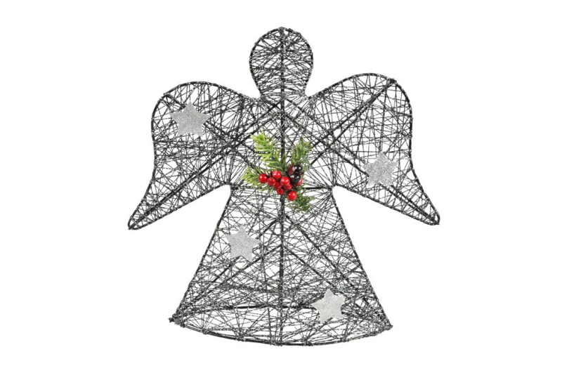 Anjel 30 cm čierno - strieborný. Anjel je vyrobený z kovu, ktorý je prepletený drôtmi a bavlnou, po celom tele má strieborné hviezdičky. Je ideálny na vianočnú výzdobu nielen v interiéri domu, ale aj vonku. Anjel môže byť aj výborným nápadom na darček pre niekoho blízkeho. Materiál: kov, bavlna Uvedená cena je za 1 ks.