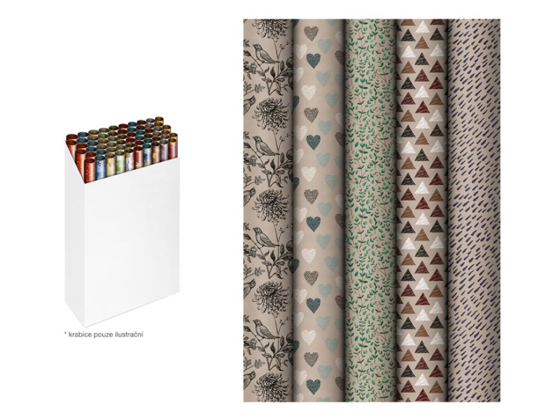 Baliaci papier, rolky s celoročným motívom, 5 rôznych vzorov. Obsah darčeka je veľmi dôležitý, ale aj to, aby bol krásne zabalený. Získajte od nás darčekový baliaci papier s celoročnými motívmi. Nezabudnite si kúpiť peknú stuhu a menovky na darček. Gramáž: 60 g Balenie: 50 ks Motív: rôzne vzory Rozmer rolky: 2000 x 700 mm Všetkých 50 ks je zabalených v kartónovej krabici. Dodávame v mixe podľa skladových zásob. Cena je uvedená za 1 ks.