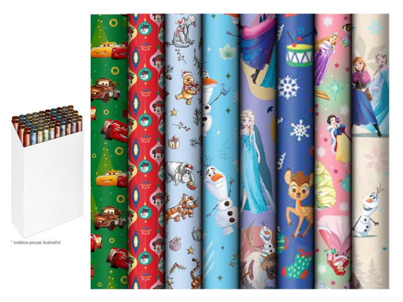 Baliaci papier - Disney vianočné rolky - 8 rôznych vzorov. Obsah vianočného darčeka je veľmi dôležitý, ale aj to, aby bol pod stromčekom krásne zabalený. Zaobstarajte si baliaci papier na vianočné darčeky s detskými motívmi od Walta Disneyho. Nezabudnite si kúpiť peknú stuhu a menovky na darček. Gramáž: 55 g Balenie: 60 ks Rozmer rolky: 1000 x 700 mm Vzor: Disneyho rozprávkové motívy Všetkých 60 ks je zabalených v kartónovej krabici. Dodávame v mixe podľa skladových zásob. Cena je za 1 ks.