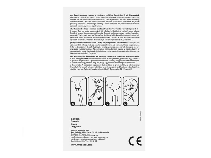 Nafukovací fóliový balónik v tvare čísla 3. Balónik je vyrobený zo striebornej fólie. Na hornom okraji balónu sú očká na priviazanie. Balóniky sú vhodné na narodeninové oslavy, firemné párty a iné spoločenské udalosti. Výška balónu: 40 cm Uvedená cena je za 1 ks Balenie obsahuje: balónik, trubičku na nafukovanie, návod. Návod na nafukovanie balónika: 1. Vybaľte balónik a plastovú trubičku z obalu 2. Zasuňte trubičku do otvoru na nafukovanie, ktorý je umiestnený na spodnej strane balónika. 3. Fúkaním cez trubičku nafúknite balónik 4. Opatrne vytiahnite trubičku z balónika (systém je navrhnutý tak, aby ste nemuseli balónik zaväzovať) 5. Na vyfúkanie balónika zasuňte trubičku opäť do otvoru a tlačte na balónik Varovanie: Vhodné pre deti od 8 rokov. Deti sa môžu prasknutými alebo spustenými balónikmi zadusiť alebo uškrtiť. Používajte ich len za prítomnosti dospelej osoby. Dospelá osoba sa po nafúknutí balónu musí presvedčiť, že ho deti používajú bezpečne. Spustené balóniky udržiavajte mimo dosahu detí, prasknuté ihneď zlikvidujte. K nafúknutiu balónika používajte hustilku. Nepribližujte balónik k očiam a k tvári. Po prasknutí môže balónik poraniť. Je vyrobený z prírodného kaučuku, latexu. Je určený k dekoratívnym cieľom. Je tu nebezpečenstvo vdýchnutia a prehltnutia malých častíc.