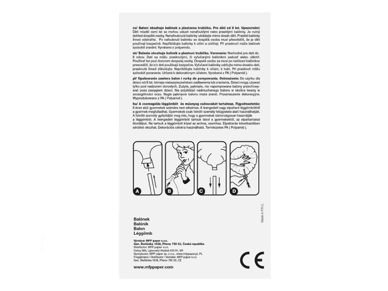 Nafukovací fóliový balónik v tvare čísla 8. Balónik je vyrobený zo striebornej fólie. Na hornom okraji balónu sú očká na priviazanie. Balóniky sú vhodné na narodeninové oslavy, firemné párty a iné spoločenské udalosti. Výška balónu: 40 cm Uvedená cena je za 1 ks Balenie obsahuje: balónik, trubičku na nafukovanie, návod. Návod na nafukovanie balónika: 1. Vybaľte balónik a plastovú trubičku z obalu 2. Zasuňte trubičku do otvoru na nafukovanie, ktorý je umiestnený na spodnej strane balónika. 3. Fúkaním cez trubičku nafúknite balónik 4. Opatrne vytiahnite trubičku z balónika (systém je navrhnutý tak, aby ste nemuseli balónik zaväzovať) 5. Na vyfúkanie balónika zasuňte trubičku opäť do otvoru a tlačte na balónik Varovanie: Vhodné pre deti od 8 rokov. Deti sa môžu prasknutými alebo spustenými balónikmi zadusiť alebo uškrtiť. Používajte ich len za prítomnosti dospelej osoby. Dospelá osoba sa po nafúknutí balónu musí presvedčiť, že ho deti používajú bezpečne. Spustené balóniky udržiavajte mimo dosahu detí, prasknuté ihneď zlikvidujte. K nafúknutiu balónika používajte hustilku. Nepribližujte balónik k očiam a k tvári. Po prasknutí môže balónik poraniť. Je vyrobený z prírodného kaučuku, latexu. Je určený k dekoratívnym cieľom. Je tu nebezpečenstvo vdýchnutia a prehltnutia malých častíc.