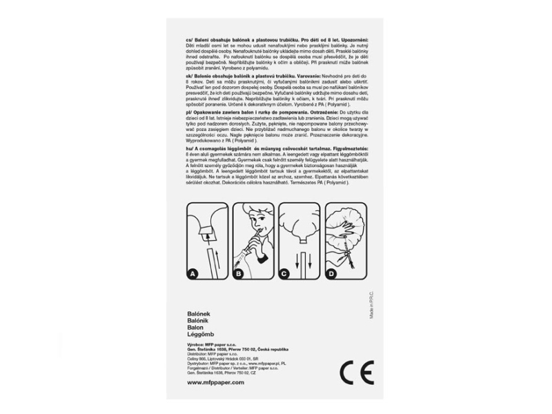 Nafukovací fóliový balónik v tvare č. 9. Hitom posledných rokov sú obľúbené balóniky v tvare číslic, ktoré oživia celú narodeninovú oslavu a určite potešia oslávenca. Narodeninová oslava sa môže začať! Balónik je vyrobený zo striebornej fólie. Na hornej strane balónika sú očká na priviazanie. Výška balónika: 75 cm BALENIE OBSAHUJE: -balónik -brko na nafúknutie -návod NÁVOD K NAFÚKNUTIU BLÓNIKA: 1. vybaľte balónik a plastové brko z obalu 2. zasuňte brko do otvoru na nafukovanie, ktorý je umiestnený na spodnej strane balónika 3. fúkaním cez brko nafúknete balónik 4. opatrne vytiahnite brko z balónika (systém je navrhnutý tak, že nemusíte ústie balónika zaväzovať) 5. k vyfúknutiu balónika zasuňte brko opäť do otvoru a tlačte na balónik VAROVANIE: Vhodné pre deti od 8 rokov. Deti sa môžu prasknutými či vyfúkanými balónikmi zadusiť alebo uškrtiť. Používajte ich len pod dozorom dospelej osoby. Dospelá osoba sa po nafúknutí balónu musí presvedčiť, že ho deti používajú bezpečne. Vyfúknuté balóny udržiavajte mimo dosahu detí a prasknuté ihneď zlikvidujte. K nafukovaniu balónikov používajte hustilku. Nepribližujte balóny k očiam a k tvári. Pri prasknutí môže balónik spôsobiť zranenie. Vyrobené sú z prírodného kaučuku, latexu. Určené k dekoratívnym účelom. Nebezpečenstvo vdýchnutia a prehltnutia malých častí. Uvedená cena je za 1 ks. Dodávame vo vrecku.
