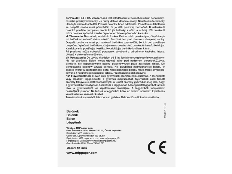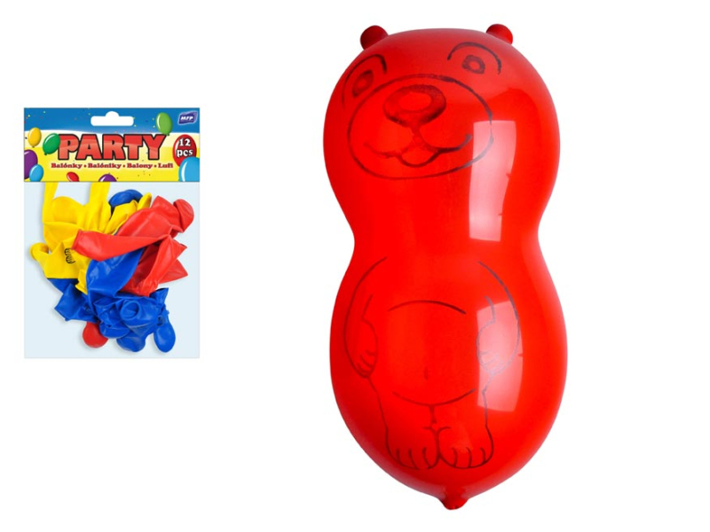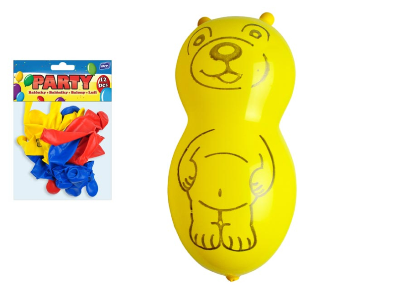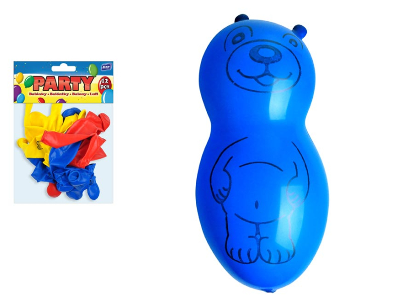 Nafukovací balónik v tvare medvedíka. Dodávame v mixe farieb. Uvedená cena je za jedno balenie, v ktorom je 12 balónikov. Varovanie: Vhodné pre deti od 8 rokov. Deti sa môžu prasknutými alebo spustenými balónikmi zadusiť, uškrtiť. Používajte len pod dozorom dospelej osoby. Dospelá osoba sa po nafúknutí balónika musí presvedčiť, že ho deti používajú bezpečne. Spustené balóniky udržiavajte mimo dosahu detí, prasknuté ihneď zlikvidujte. K nafukovaniu používajte hustilku. Nepribližujte k očiam a k tvári. Pri prasknutí môže balónik spôsobiť zranenie. Je vyrobený z prírodného kaučuku, latexu. Je určený na dekoratívne ciele. Nebezpečenstvo vdýchnutia a prehltnutia drobných častíc.