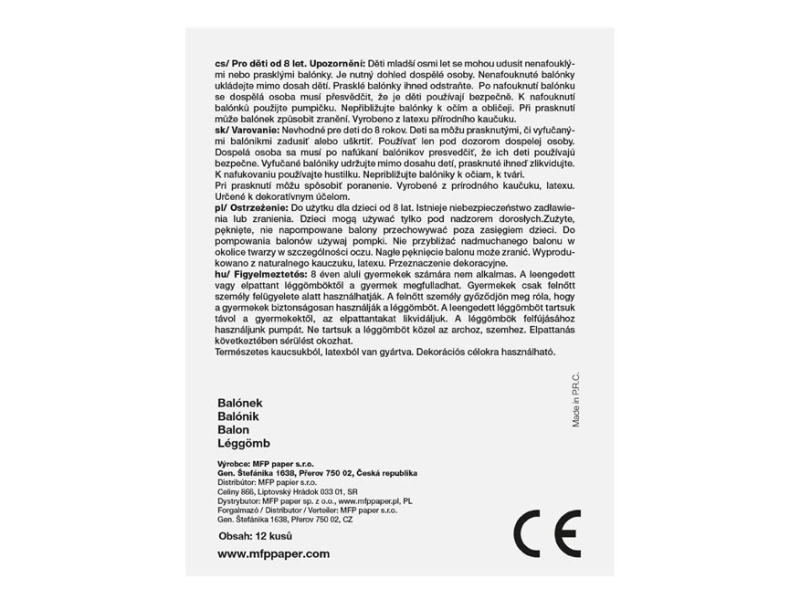 Nafukovací balónik s potlačou Všetko najlepšie - balóniky sú obľúbeným dekoračným doplnkom na narodeninovej oslave či iné významné udalosti. Nafukovacie balóniky nesmú chýbať na žiadnej oslave, dodajú tú pravú atmosféru do celej miestnosti a narodeninová párty môže začať! BALENIE OBSAHUJE: - 12 ks farebných balónikov s nápisom "Všetko najlepšie" Varovanie: Nevhodné pre deti do 8 rokov. Deti sa môžu prasknutými, či vyfučanými balónikmi zadusiť alebo uškrtiť. Používať len pod dozorom dospelej osoby. Dospelá osoba sa musí po nafúkaní balónikov presvedčiť, že ich deti používajú bezpečne. Vyfučané balóniky udržujte mimo dosahu detí, prasknuté ihneď zlikvidujte. K nafukovaniu používajte hustilku. Nepribližujte balóniky k očiam, k tvári. Pri prasknutí môžu spôsobiť poranenie. Vyrobené z prírodného kaučuku, latexu. Určené k dekoratívnym účelom. Dodávame v sáčku so závesom. Uvedená cena je za 1 balenie po 12 ks.
