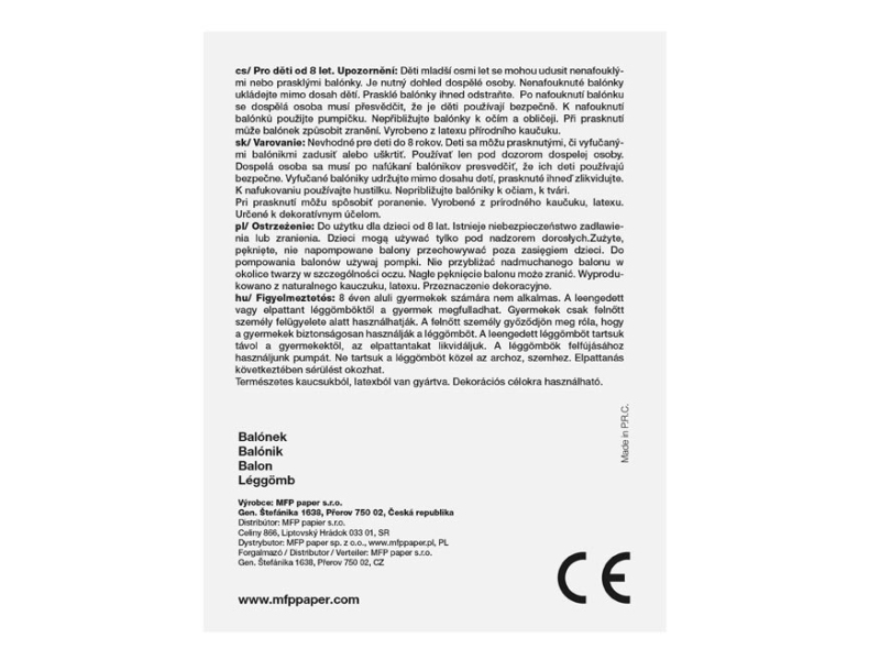 Nafukovací balónik M štandard 2,8 g - 30 cm, mix. Balóniky sú obľúbeným dekoračným doplnkom na narodeninovej oslave či inej významnej udalosti. Nafukovacie balóniky nesmú chýbať na žiadnej oslave, dodajú tú pravú atmosféru do celej miestnosti a narodeninová párty môže začať! BALENIE OBSAHUJE: - 100 ks bielych balónikov VAROVANIE: Vhodné pre deti od 8 rokov. Deti sa môžu prasknutými či vyfúknutými balónikmi zadusiť alebo uškrtiť. Používajte iba pod dozorom dospelej osoby. Dospelá osoba sa po nafúknutí balónika musí presvedčiť, že ho deti používajú bezpečne. Vyfúknuté balóniky udržujte mimo dosahu detí a prasknuté ihneď zlikvidujte. Na nafukovanie balónikov použite pumpičku. Nepribližujte balóniky k očiam a tvári. Pri prasknutí môže balónik spôsobiť zranenie. Vyrobené z prírodného kaučuku, latexu. Určené na dekoratívne účely. Nebezpečenstvo vdýchnutia a prehltnutia malých častíc. Dodávame iba v sáčku so závesom po 100 ks. Uvedená cena je za 1 ks.