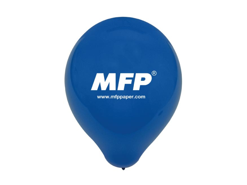 Nafukovací modrý balónik s reklamnou bielou potlačou MFP. Uvedená cena je za 1 ks.