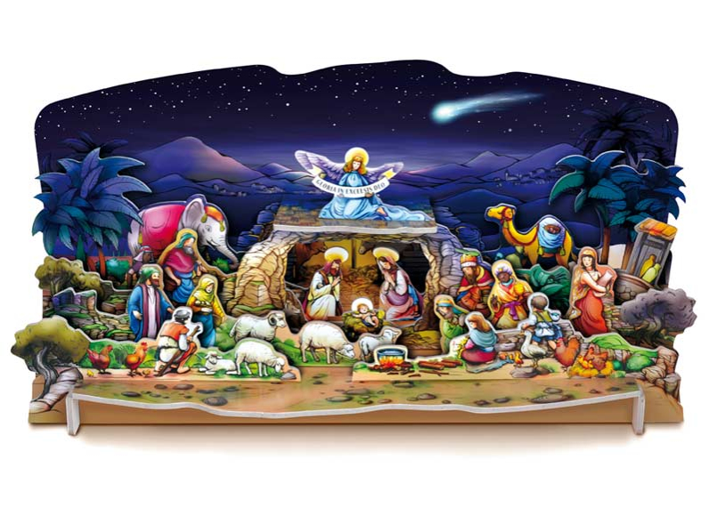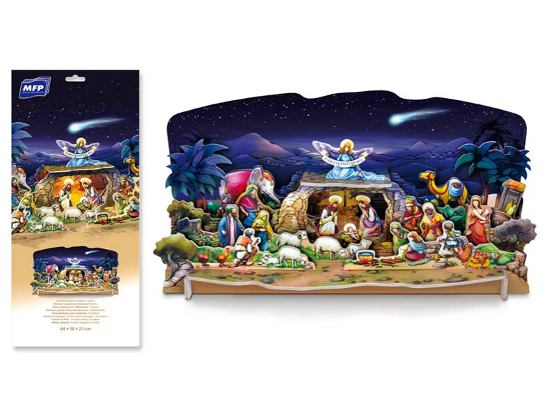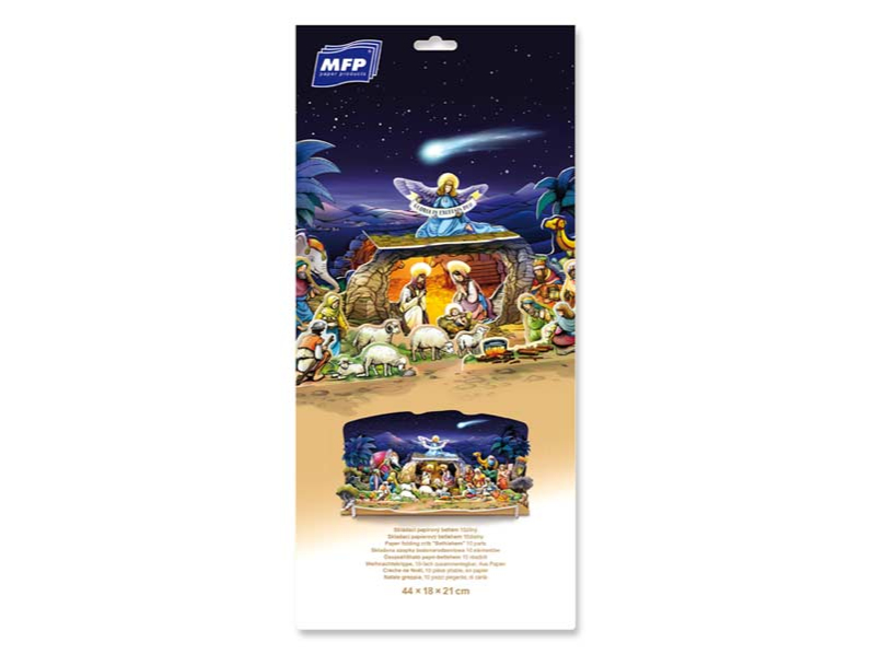 Vysekávaný, jednoducho zostaviteľný betlehem bez lepidla a nožníc. Oživí Vašu miestnosť a naladí Vám doma vianočnú atmosféru. Nájdete tu kreslené postavičky Jozefa Lady, stačí ich iba vytlačiť z podložky a potom zostaviť do finálnej podoby. Betlehem je vyrobený z 3 mm hrubej lepenky, potiahnutej laminom. Dodávame v plastovom vrecku so závesom. Uvedená cena je za 1 ks.