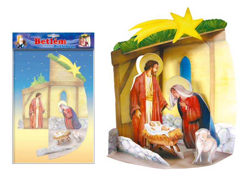 Poskladajte si papierový betlehem s Jozefom, Máriou a malým Ježiškom v jasličkách. Zostavenie je veľmi jednoduché a nepotrebujete k nemu žiadne nástroje. Betlehem má glitre a dá sa veľmi ľahko rozložiť a zase uschovať. Dodávame vo vrecúšku so závesom. Uvedená cena je za 1 ks.