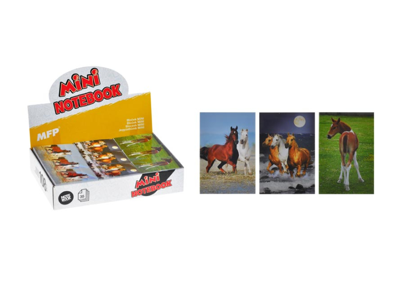 Detský bloček s vodotlačou vhodný na poznámky s motívom koní. Balenie: 108 ks Počet listov: 35 Motív: kone (3 motívy) Všetkých 108 ks je balených v krabičke. Dodávame v mixe podľa skladovej zásoby. Uvedená cena je za 1 ks.