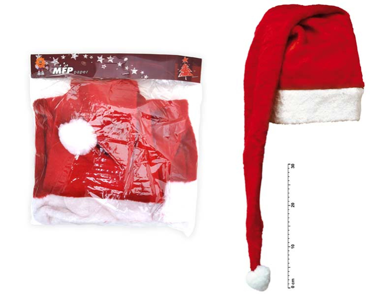 Mikulášska čiapka, dlhá v červenobielom prevedení. Táto čiapka skvele doplní váš kostým Mikuláša. Stačí ešte nájsť anjela, čerta a môžete sa vypraviť rozdávať nádielku deťom. Obvod hlavy: 58 cm Dĺžka čiapky aj s brmbolcom: 90 cm Balené v sáčku so závesom. Uvedená cena je za 1 ks.