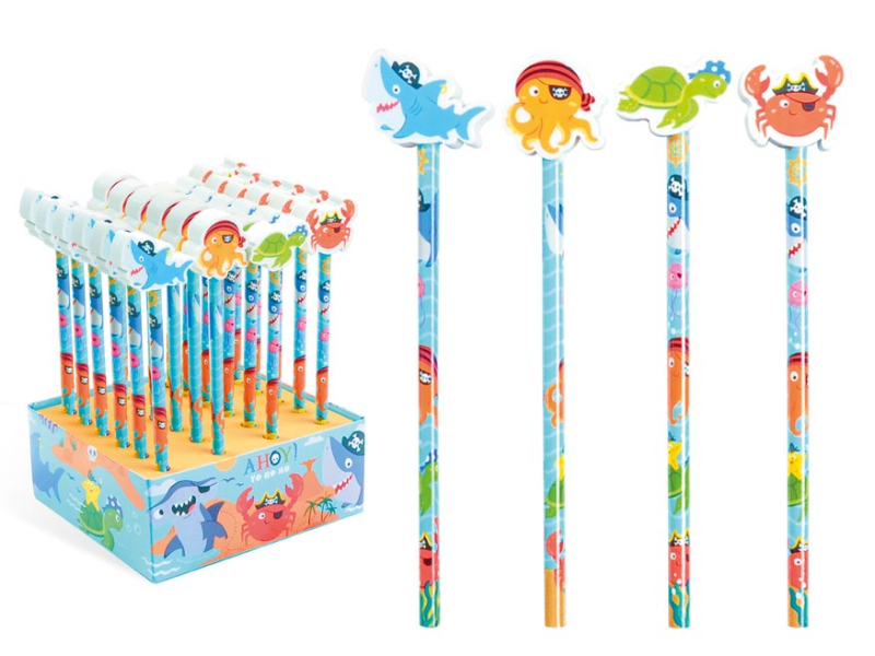 Grafitová ceruzka s gumou na konci, mix motívov morských živočíchov. MOTÍV: - žralok - chobotnica - korytnačka - krab Uvedená cena je za 1 ks.