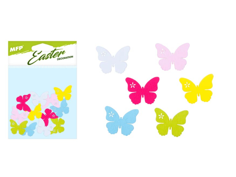 Velikonoční dřevěná dekorace motýl v mixu barev. Plánujete si udělat pohodové odpoledne a vyzdobit si dům nebo zahradu a přivítat tak jaro? Pak vám nesmí chybět tyto krásné dekorace v podobě různě barevných motýlů. Dekoraci lze použít k aranžování velikonočních věnců nebo větviček. Vyrobeno z překližky. OBSAH BALENÍ: - 12 ks motýlů Velikost: 30 mm Barva: bílá, světe růžová, růžová, žlutá, zelená, modrá Baleno v sáčku se závěsem. Uvedená cena je za 1 balení.