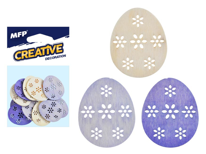 Veľkonočná dekorácia vajcia drevené, vyrezávané. Ozdobte si byt touto krásnou dekoráciou. Dekoráciu môžete použiť k aranžovaniu vencov a rôznych doplnkov do interiéru. BALENIE OBSAHUJE: -12 vajíčok (žlté, fialové, modré) Dodávame vo vrecku so závesom. Uvedená cena je za 1 balenie.