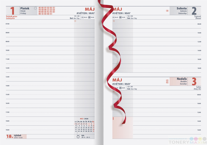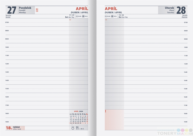 Denný diár v pestrej farebnej škále vo formáte A5 s bohatým obsahom. Kvalitný diár s hodinovým delením (7:00 - 19:00) obsahuje slovenské a české kalendárium, anglický preklad mesiacov a dní, informácie o štátnych sviatkoch všetkých krajín EÚ, prehľadný a plánovací kalendár (fond pracovného času), školské prázdniny, prehľad slovenských EČV, adresár. Ponúka dostatočný priestor pre písanie poznámok a pripomienok.