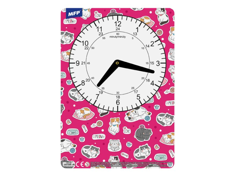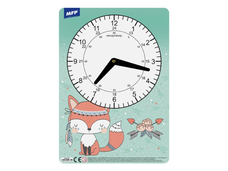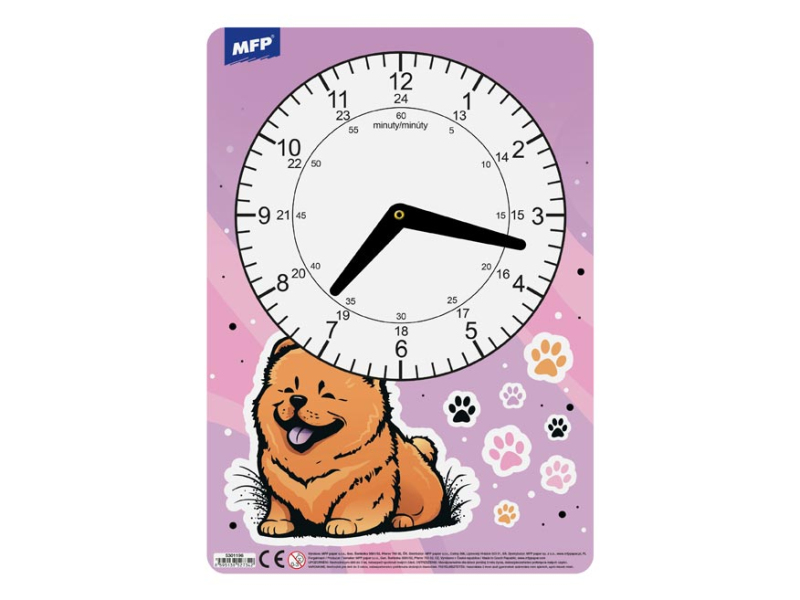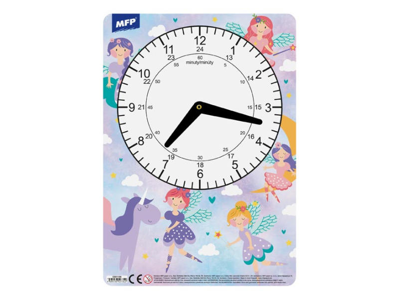 Detské papierové hodiny v kombinácii dievčenských motívov. Didaktická pomôcka, dobre využiteľná na výučbu času pre predškolákov alebo prvákov. Tieto cvičné hodiny nesmú chýbať Vášmu dieťaťu pri nástupe do prvej triedy základnej školy. Motívy: pes(Čau-čau), líška, víly, mačky Upozornenie: Nevhodné pre deti mladšie ako 3 roky. Nebezpečenstvo vdýchnutia a prehltnutia malých častíc. Dodávame v mixe 4 ks podľa skladových zásob. Uvedená cena je za 1 ks.