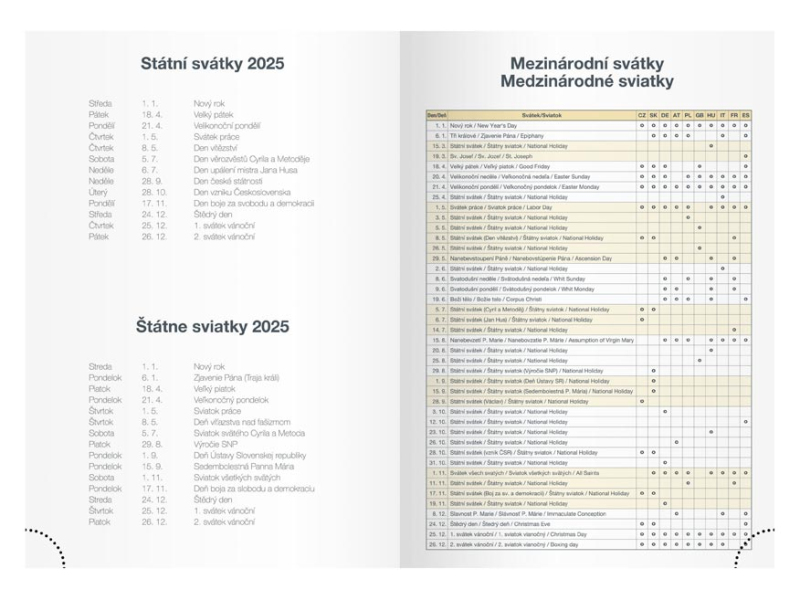 Týždenný diár pre rok 2025 vo formáte A5 v kvetinovom vzore, ktorý je výborným pomocníkom na organizovanie Vášho času. Diár má odtrhávateľný spodný rožok, ktorý umožní rýchle nalistovanie aktuálneho týždňa. Povrch obálky je vyrobený z lesklého lamina. DIÁR OBSAHUJE: - priestor pre osobné údaje - ročný prehľad roka - plánovací kalendár - štvrťročný plánovací kalendár - abecedný zoznam mien - štátne sviatky - medzinárodné sviatky - mapy - menné kalendárium - číslovanie týždňov - štátne sviatky a významné dni - východy a západy Slnka - fáza mesiaca - letný a zimný čas - znamenie - prehľad mesiaca - priestor pre poznámky Motív: kvety Väzba: šitá V8 Rozsah: 144 strán Rozmer: 140 × 205 mm Kalendárium: československé týždenné Povrchy a spracovanie obálky: lesklé lamino Uvedená cena je za 1 ks.