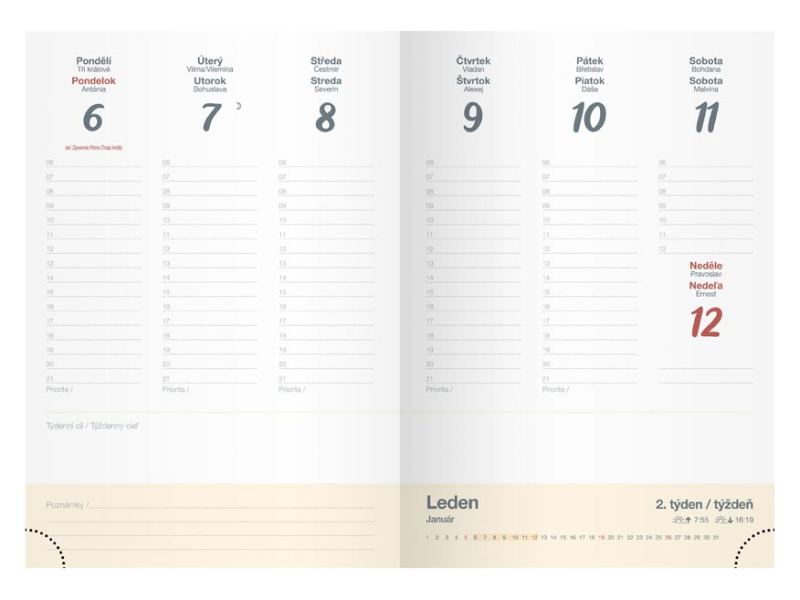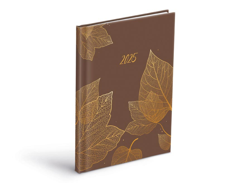 Týždenný diár pre rok 2025 vo formáte A5, v hnedej farbe, s motívom listov, ktorý je výborným pomocníkom na organizovanie Vášho času. Diár má odtrhávateľný spodný rožok, ktorý umožní rýchle nalistovanie aktuálneho týždňa. Povrch obálky je vyrobený z lesklého lamina. DIÁR OBSAHUJE: - priestor pre osobné údaje - ročný prehľad roka - plánovací kalendár - štvrťročný plánovací kalendár - abecedný zoznam mien - štátne sviatky - medzinárodné sviatky - mapy - menné kalendárium - číslovanie týždňov - štátne sviatky a významné dni - východy a západy Slnka - fáza mesiaca - letný a zimný čas - znamenie - prehľad mesiaca - priestor pre poznámky Motív: listy Farba: hnedá Väzba: šitá V8 Rozsah: 144 strán Rozmer: 140 × 205 mm Kalendárium: československé týždenné Povrchy a spracovanie obálky:lesklé lamino Uvedená cena je za 1 ks.