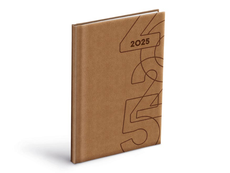 Týždenný diár na rok 2025 vo formáte A5 s elegantnou obálkou v hnedej farbe. Obálka je zdobená jemným reliéfnym motívom tvoreným veľkými číslicami "2025" v modernom, geometrickom štýle. Číslice sú decentne vyryté do povrchu obálky, čo jej dodáva sofistikovaný a minimalistický vzhľad. Povrch obálky je vyrobený z kvalitného materiálu, ktorý je na dotyk príjemný a zároveň zaisťuje odolnosť a dlhú životnosť diára. Tento diár je ideálnym pomocníkom pre efektívnu organizáciu vášho času. DIÁR OBSAHUJE: - ročný prehľad roka - plánovací kalendár - štvrťročný plánovací kalendár - abecedný zoznam mien - štátne sviatky - medzinárodné sviatky - 7 strán pre poznámky - mapy - menné kalendárium - číslovanie týždňov - štátne sviatky a významné dni - východy a západy Slnka - fáza mesiaca - letný a zimný čas - znamenie - prehľad dvoch mesiacov Väzba: šitá V8 Rozsah: 144 strán Farba: svetlo hnedá Rozmer: 140 × 205 mm Povrchy a spracovanie obálky: PU Kalendárium: československé týždenné Uvedená cena je za 1 ks.