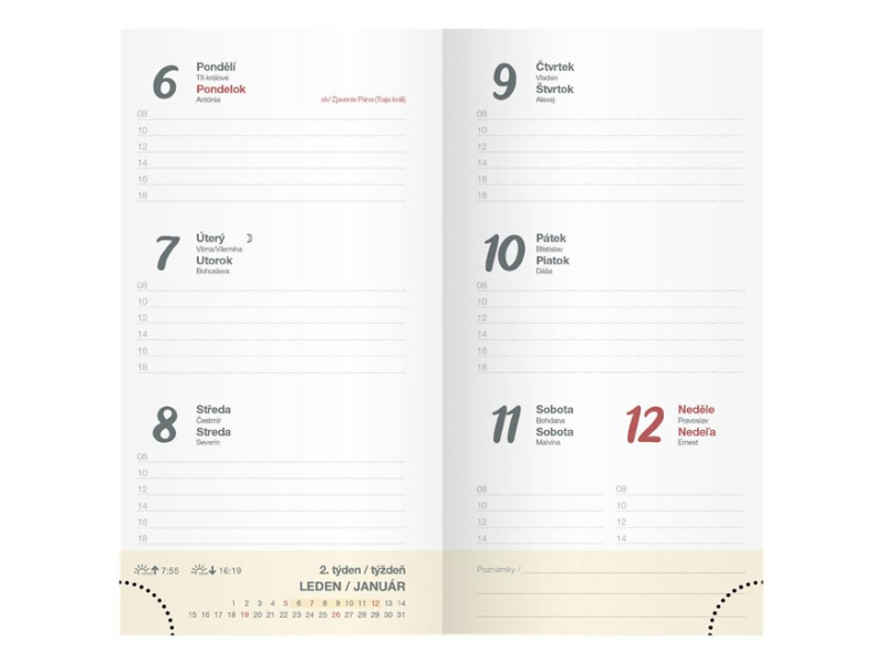 Týždenný diár na rok 2025, ktorý vás očarí svojou eleganciou a jemným dizajnom. Obálka je vyrobená z lesklého lamina, čo jej dodáva luxusný vzhľad a je príjemná na dotyk. Tento diár je nielen praktickým pomocníkom pre každodennú organizáciu vášho času, ale aj štýlovým doplnkom. Výhodou je aj skladný rozmer, ktorý zároveň poskytuje dostatok miesta na poznámky. DIÁR OBSAHUJE: - ročný prehľad roka - plánovací kalendár - štvrťročný plánovací kalendár - abecedný zoznam mien - štátne sviatky - medzinárodné sviatky - 7 strán pre poznámky - mapy - menné kalendárium - číslovanie týždňov - štátne sviatky a významné dni - východy a západy Slnka - fáza mesiaca - letný a zimný čas - znamenie - prehľad dvoch mesiacov Väzba: šitá V8 Rozsah: 128 strán Rozmer: 90 × 170 mm Kalendárium: československé týždenné Povrchy a spracovanie obálky: lesklé lamino Uvedená cena je za 1 ks.