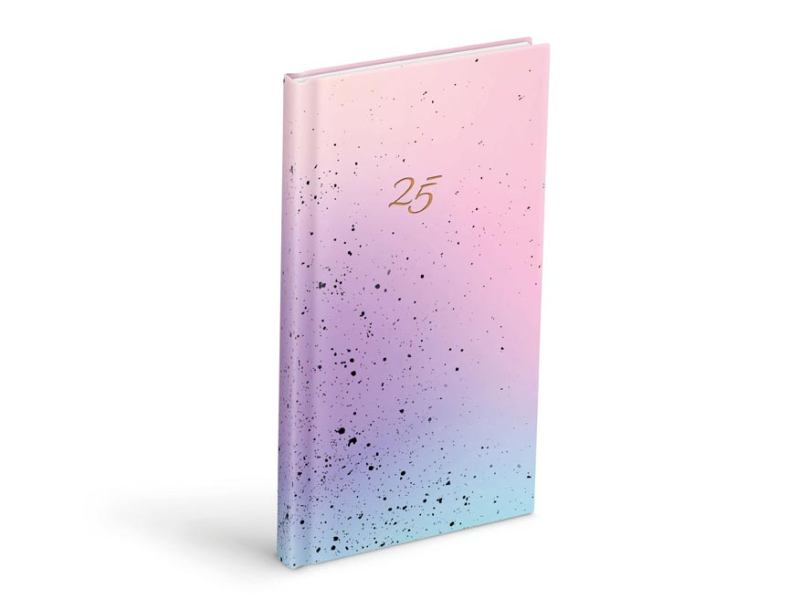 Týždenný diár pre rok 2025 s modernou obálkou v pastelových farbách prechádzajúcich z ružovej do modrej. Obálka je zdobená jemnými čiernymi škvrnami, ktoré dodávajú diáru unikátny a štýlový vzhľad. Obálka je vyrobená z lesklého lamina a je príjemná na dotyk. Tento diár ponúka skladný rozmer, ktorý poskytuje dostatok miesta na poznámky a je ideálnym pomocníkom pre organizáciu vášho času. DIÁR OBSAHUJE: - ročný prehľad roka - plánovací kalendár - štvrťročný plánovací kalendár - abecedný zoznam mien - štátne sviatky - medzinárodné sviatky - 7 strán pre poznámky - mapy - menné kalendárium - číslovanie týždňov - štátne sviatky a významné dni - východy a západy Slnka - fáza mesiaca - letný a zimný čas - znamenie - prehľad dvoch mesiacov Väzba: šitá V8 Rozsah: 128 strán Rozmer: 90 × 170 mm Kalendárium: československé týždenné Povrchy a spracovanie obálky: lesklé lamino Uvedená cena je za 1 ks.