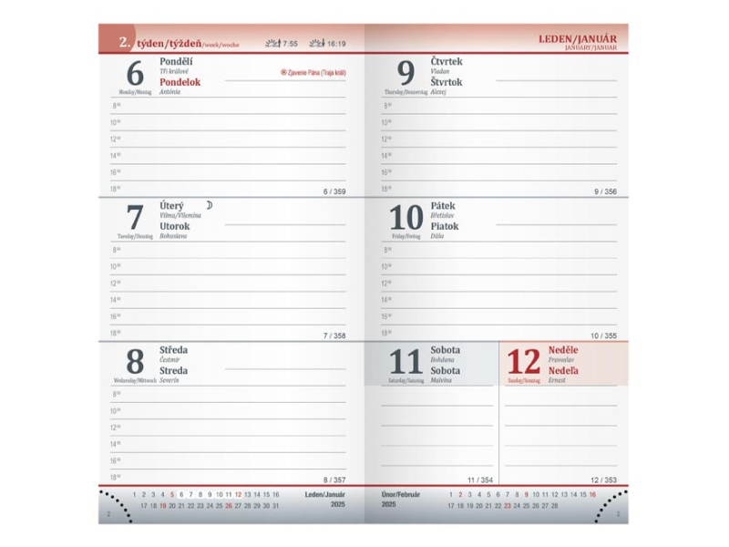 Týždenný diár na rok 2025 v šedej farbe. Povrch obálky je vyrobený z mäkčeného materiálu príjemného na dotyk. Diár má odtrhávateľný spodný rožok, ktorý umožní rýchle nalistovanie aktuálneho dňa. Je výborným pomocníkom pri organizovaní Vášho času. Výhodou je aj praktický, skladný rozmer, pri zachovaní dostatku miesta na poznámky. DIÁR OBSAHUJE: - ročný prehľad roka - plánovací kalendár - štvrťročný plánovací kalendár - abecedný zoznam mien - štátne sviatky - medzinárodné sviatky - 7 strán pre poznámky - mapy - menné kalendárium - číslovanie týždňov - štátne sviatky a významné dni - východy a západy Slnka - fáza mesiaca - letný a zimný čas - znamenie - prehľad dvoch mesiacov Farba: šedá Väzba: šitá V8 Rozsah: 128 strán Rozmer: 90 × 170 mm Povrchy a spracovanie obálky: PU Kalendárium: československé týždenné Uvedená cena je za 1 ks.