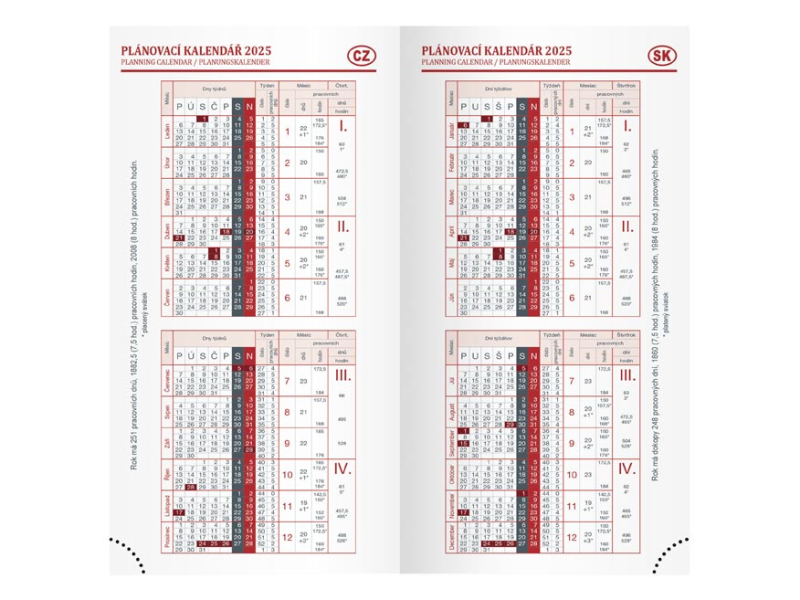 Týždenný diár pre rok 2025 v kombinácii šedej a modrej farby. Povrch obálky je vyrobený z mäkčeného materiálu príjemného na dotyk. Diár má odtrhávateľný spodný rožok, ktorý umožní rýchle nalistovanie aktuálneho dňa. Je výborným pomocníkom pri organizovaní Vášho času. Výhodou je aj praktický, skladný rozmer, pri zachovaní dostatku miesta na poznámky. DIÁR OBSAHUJE: - ročný prehľad roka - plánovací kalendár - štvrťročný plánovací kalendár - abecedný zoznam mien - štátne sviatky - medzinárodné sviatky - 7 strán pre poznámky - mapy - menné kalendárium - číslovanie týždňov - štátne sviatky a významné dni - východy a západy Slnka - fáza mesiaca - letný a zimný čas - znamenie - prehľad dvoch mesiacov Väzba: šitá V8 Rozsah: 128 strán Farba: šedá, modrá Rozmer: 90 × 170 mm Povrchy a spracovanie obálky: PU Kalendárium: československé týždenné Uvedená cena je za 1 ks.