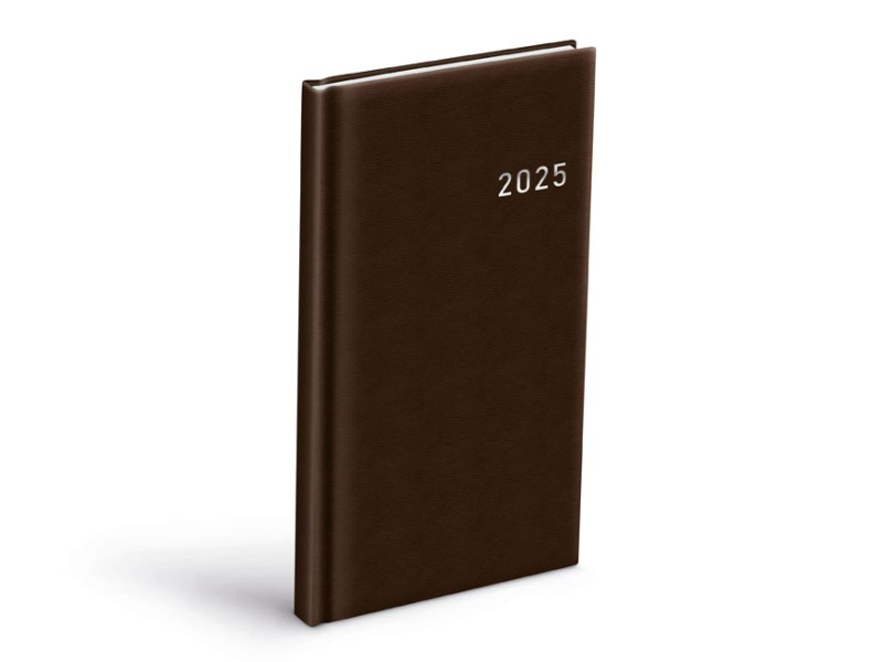 Týždenný diár na rok 2025 v tmavo hnedej farbe. Je výborným pomocníkom pri organizovaní Vášho času. Povrch obálky je vyrobený z PVC. Diár má odtrhávateľný spodný rožok, ktorý umožní rýchle nalistovanie aktuálneho týždňa. Výhodou je aj praktický, skladný rozmer, pri zachovaní dostatku miesta na poznámky. DIÁR OBSAHUJE: - ročný prehľad roka - plánovací kalendár - štvrťročný plánovací kalendár - abecedný zoznam mien - štátne sviatky - medzinárodné sviatky - 7 strán pre poznámky - mapy - menné kalendárium - číslovanie týždňov - štátne sviatky a významné dni - východy a západy Slnka - fáza mesiaca - letný a zimný čas - znamenie - prehľad dvoch mesiacov Väzba: šitá V8 Rozsah: 128 strán Farba: tmavo hnedá Rozmer: 90 × 170 mm Povrchy a spracovanie obálky: PVC Kalendárium: československé týždenné Uvedená cena je za 1 ks.