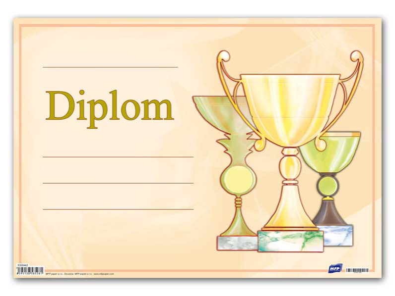 Farebný detský diplom. Obsahuje 3 riadky, kam môžete napísať meno, umiestnenie, za čo dostal diplom, prípadne kto ho udeľuje. Formát: A4 Gramáž:300g Druh papiera: kriedový, matný