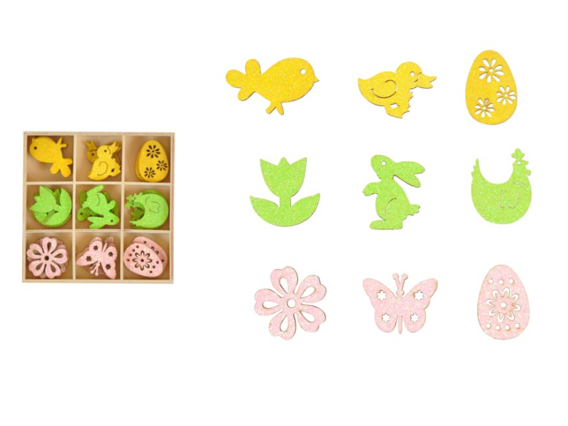 Drevené veľkonočné dekorácie. Vyzdobte si byt veľkonočnými dekoráciami a privítajte tak sviatky jari. Tieto drevené dekorácie môžu byť použité na dekorovanie veľkonočných vencov, košíkov, vetvičiek a pod. BALENIE OBSAHUJE: -27 ks veľkonočných farebných dekorácií (9 motívov) Veľkosť: 3 cm Dodávame v drevnej škatuli. Uvedená cena je za 1 balenie.