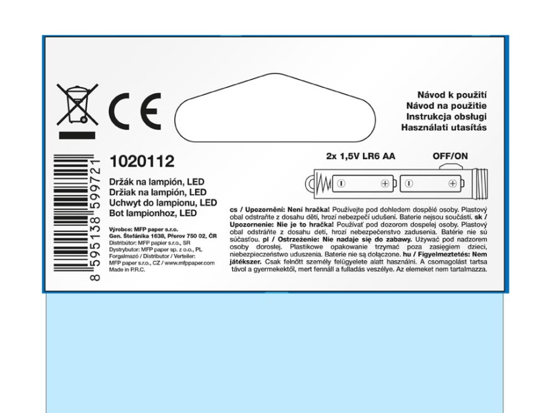 Svietiaci plastový držiak na lampión s LED osvetlením. Ideálny pomocník na lampiónový sprievod, alebo na párty. Plastová tyčka je na konci vybavená háčikom na zavesenie lampiónu. V rúčke je priestor na dve ceruzkové batérie, ktoré napája LED diódu, ktorá je potom umiestnená vo vnútri lampiónu. Na rúčke je umiestnený posuvný spínač ktorým je možné svetlo vypnúť a zapnúť. Dĺžka: 50 cm Napájanie: 2 ks batérie AA 1,5 V Dodávame v sáčku. Batérie nie sú súčasťou balenia. Uvedená cena je za 1 ks.