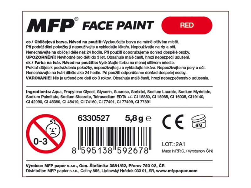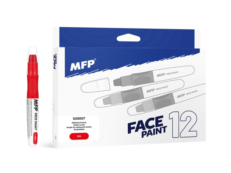 Farba na tvár červená, na princípe rúžu (6 g). Vďaka týmto pestrým farbám vykúzlite na tvári dieťaťa krásnu masku na karneval, párty alebo inú oslavu. Dermatologicky testované. Farba: červená NÁVOD NA POUŽITIE: 1. Odporúčame vyskúšať farbičky na menej citlivom mieste. 2. Ak dôjde k podráždeniu pokožky, nepoužívajte a vyhľadajte lekára. 3. Nepoužívajte na pery a oči. 4. Farbičkami maľujeme na suchú pokožku. 5. Jednoducho umývateľné vodou a mydlom, farby zdravotne nezávadné. 6. Neodporúčame nechávať na tvári dlhšie ako 24 hodín. 7. Pri použití odporúčame dohľad dospelej osoby. VAROVANIE: Nevhodné pre deti do 3 rokov, nebezpečenstvo prehltnutia malých častí. Všetkých 12 ks je balených v papierovej krabičke. Uvedená cena je za 1 ks.