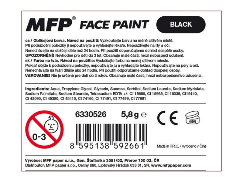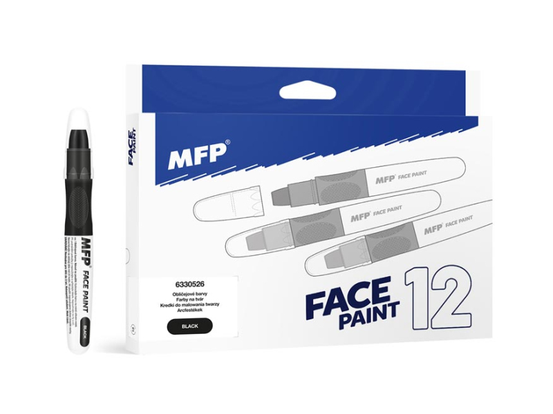 Farba na tvár čierna, na princípe rúžu (6 g). Vďaka týmto pestrým farbám vykúzlite na tvári dieťaťa krásnu masku na karneval, párty alebo inú oslavu. Dermatologicky testované. Farba: čierna NÁVOD NA POUŽITIE: 1. Odporúčame vyskúšať farbičky na menej citlivom mieste. 2. Ak dôjde k podráždeniu pokožky, nepoužívajte a vyhľadajte lekára. 3. Nepoužívajte na pery a oči. 4. Farbičkami maľujeme na suchú pokožku. 5. Jednoducho umývateľné vodou a mydlom, farby zdravotne nezávadné. 6. Neodporúčame nechávať na tvári dlhšie ako 24 hodín. 7. Pri použití odporúčame dohľad dospelej osoby. VAROVANIE: Nevhodné pre deti do 3 rokov, nebezpečenstvo prehltnutia malých častí. Všetkých 12 ks je balených v papierovej krabičke. Uvedená cena je za 1 ks.