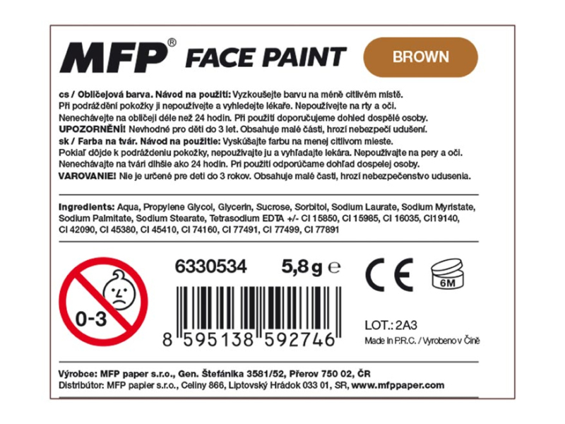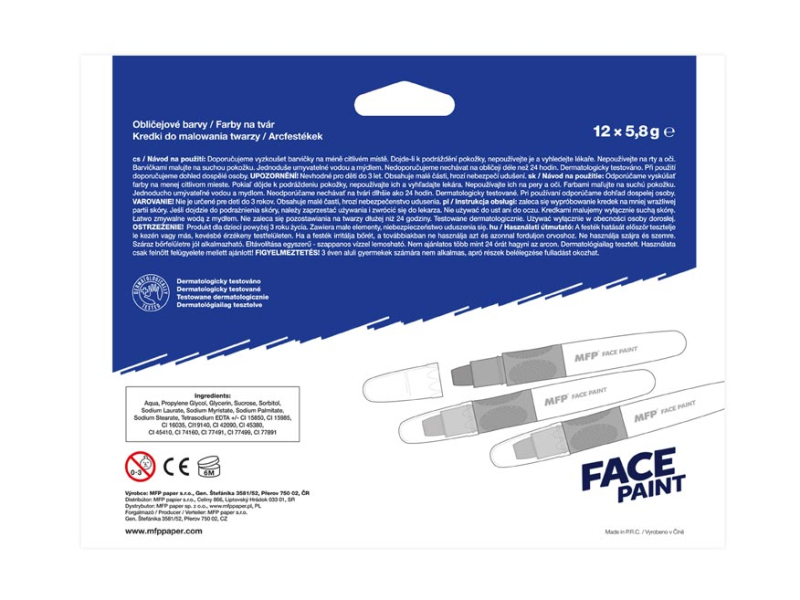 Farba na tvár hnedá, na princípe rúžu (6 g). Vďaka týmto pestrým farbám vykúzlite na tvári dieťaťa krásnu masku na karneval, párty alebo inú oslavu. Dermatologicky testované. Farba: hnedá NÁVOD NA POUŽITIE: 1. Odporúčame vyskúšať farbičky na menej citlivom mieste. 2. Ak dôjde k podráždeniu pokožky, nepoužívajte a vyhľadajte lekára. 3. Nepoužívajte na pery a oči. 4. Farbičkami maľujeme na suchú pokožku. 5. Jednoducho umývateľné vodou a mydlom, farby zdravotne nezávadné. 6. Neodporúčame nechávať na tvári dlhšie ako 24 hodín. 7. Pri použití odporúčame dohľad dospelej osoby. VAROVANIE: Nevhodné pre deti do 3 rokov, nebezpečenstvo prehltnutia malých častí. Všetkých 12 ks je balených v papierovej krabičke. Uvedená cena je za 1 ks.