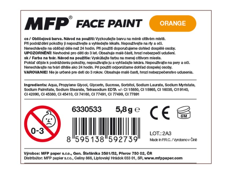 Farba na tvár oranžová, na princípe rúžu (6 g). Vďaka týmto pestrým farbám vykúzlite na tvári dieťaťa krásnu masku na karneval, párty alebo inú oslavu. Dermatologicky testované. Farba: oranžová NÁVOD NA POUŽITIE: 1. Odporúčame vyskúšať farbičky na menej citlivom mieste. 2. Ak dôjde k podráždeniu pokožky, nepoužívajte a vyhľadajte lekára. 3. Nepoužívajte na pery a oči. 4. Farbičkami maľujeme na suchú pokožku. 5. Jednoducho umývateľné vodou a mydlom, farby zdravotne nezávadné. 6. Neodporúčame nechávať na tvári dlhšie ako 24 hodín. 7. Pri použití odporúčame dohľad dospelej osoby. VAROVANIE: Nevhodné pre deti do 3 rokov, nebezpečenstvo prehltnutia malých častí. Všetkých 12 ks je balených v papierovej krabičke. Uvedená cena je za 1 ks.