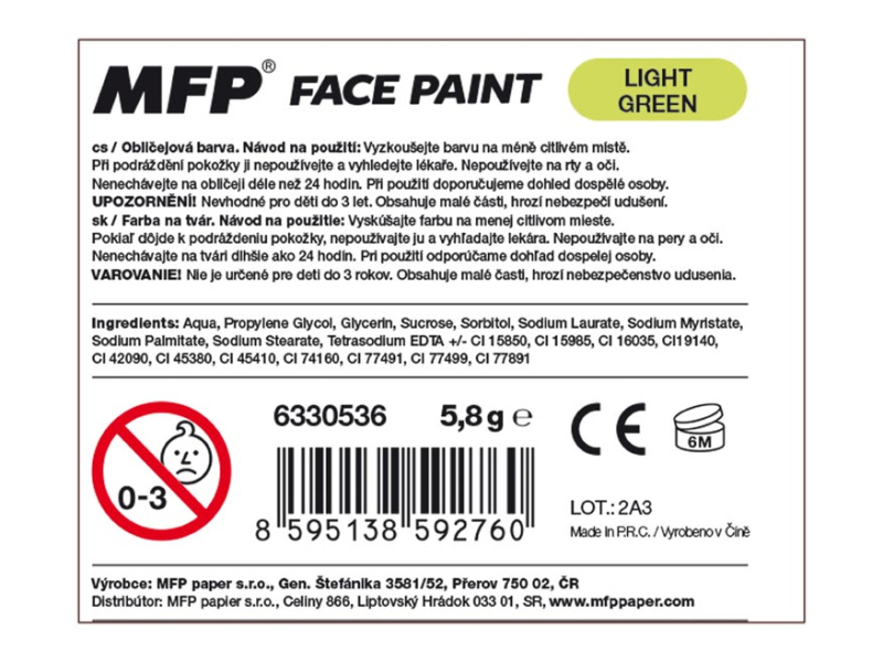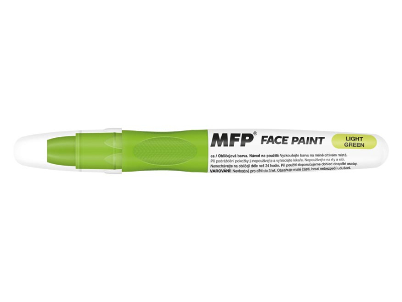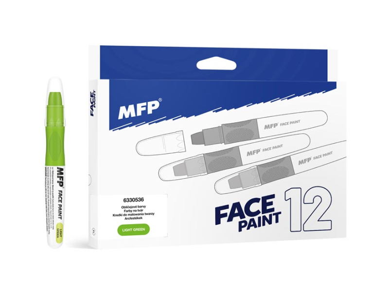 Farba na tvár svetlo zelená, na princípe rúžu (6 g). Vďaka týmto pestrým farbám vykúzlite na tvári dieťaťa krásnu masku na karneval, párty alebo inú oslavu. Dermatologicky testované. Farba: svetlo zelená NÁVOD NA POUŽITIE: 1. Odporúčame vyskúšať farbičky na menej citlivom mieste. 2. Ak dôjde k podráždeniu pokožky, nepoužívajte a vyhľadajte lekára. 3. Nepoužívajte na pery a oči. 4. Farbičkami maľujeme na suchú pokožku. 5. Jednoducho umývateľné vodou a mydlom, farby zdravotne nezávadné. 6. Neodporúčame nechávať na tvári dlhšie ako 24 hodín. 7. Pri použití odporúčame dohľad dospelej osoby. VAROVANIE: Nevhodné pre deti do 3 rokov, nebezpečenstvo prehltnutia malých častí. Všetkých 12 ks je balených v papierovej krabičke. Uvedená cena je za 1 ks.