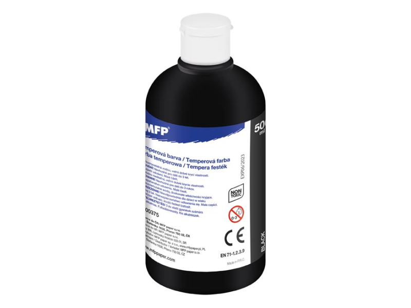 Temperové farby MFP 500 ml – čierna. Temperové farby sú pripravené k okamžitému maľovaniu, ľahko sa používajú a miešajú. Ľahko sa vyperú z väčšiny textílií, ale je dobré pred praním škvrny prečistiť ručným mydlom. Vysoká hodnota pigmentu vo farbe zaručuje maximálnu kryciu vlastnosť a kvalitu. Farby sú vynikajúco odolné proti vyblednutiu. Vďaka väčšiemu baleniu sú tieto farby vhodné pre školy, škôlky a rôzne umelecké krúžky. Farba: čierna Obsah farby v jednej fľaštičke: 500 ml VAROVANIE: Nevhodné pre deti do 3 rokov. Nebezpečenstvo prehltnutia malých častí. EN71 – 1,2,3,9 Uvedená cena je za 1 tubu.