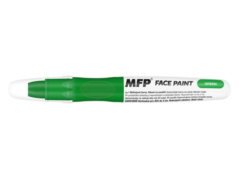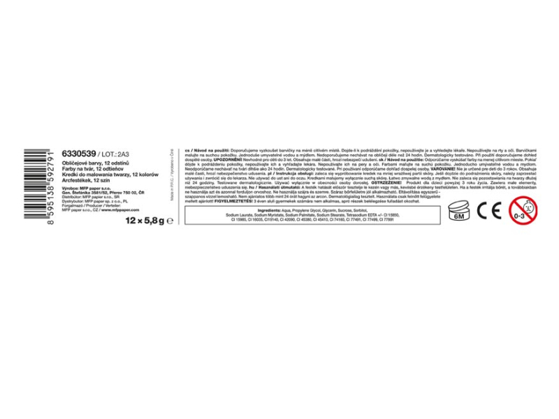 Set 12 ks farieb na tvár na princípe rúžu (72 g). Vďaka týmto pestrým farbám vykúzlite na tvári dieťaťa krásnu masku na karneval, párty alebo inú oslavu. Dermatologicky testované. FARBY: biela, červená, žltá, tmavo a svetlo zelená, tmavo a svetlo modrá, čierna, tmavo a svetlo oranžová, ružová, hnedá, NÁVOD NA POUŽITIE: 1. Odporúčame vyskúšať farbičky na menej citlivom mieste. 2. Ak dôjde k podráždeniu pokožky, nepoužívajte a vyhľadajte lekára. 3. Nepoužívajte na pery a oči. 4. Farbičkami maľujeme na suchú pokožku. 5. Jednoducho umývateľné vodou a mydlom, farby zdravotne nezávadné. 6. Neodporúčame nechávať na tvári dlhšie ako 24 hodín. 7. Pri použití odporúčame dohľad dospelej osoby. VAROVANIE: Nevhodné pre deti do 3 rokov, nebezpečenstvo prehltnutia malých častí. Všetkých 12 ks je balených v plastovej krabičke. Uvedená cena je za 1 balenie.