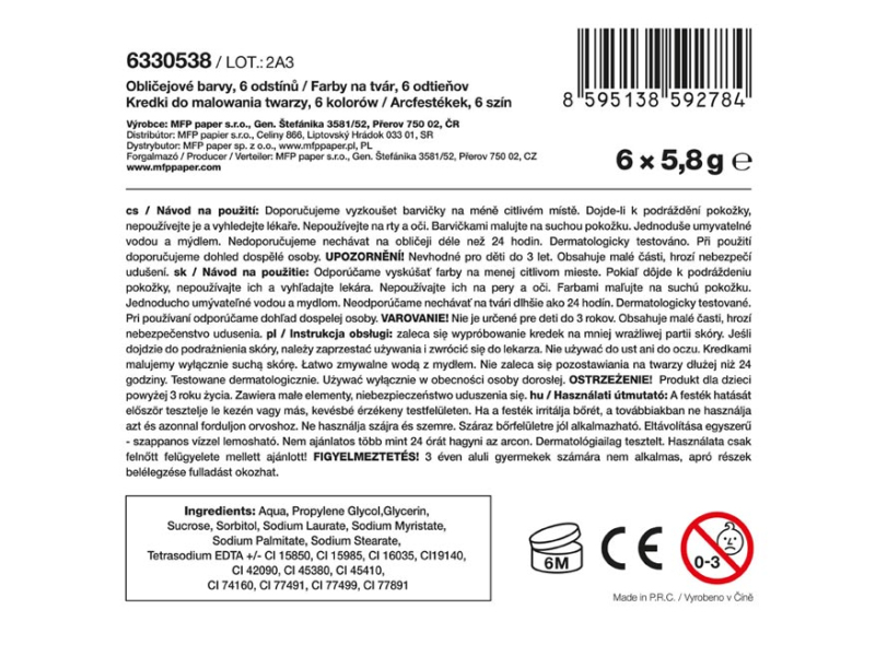 Set 6 ks farieb na tvár na princípe rúžu (36 g). Vďaka týmto pestrým farbám vykúzlite na tvári dieťaťa krásnu masku na karneval, párty alebo inú oslavu. Dermatologicky testované. FARBY: biela, červená, žltá, zelená, modrá, čierna NÁVOD NA POUŽITIE: 1. Odporúčame vyskúšať farbičky na menej citlivom mieste. 2. Ak dôjde k podráždeniu pokožky, nepoužívajte a vyhľadajte lekára. 3. Nepoužívajte na pery a oči. 4. Farbičkami maľujeme na suchú pokožku. 5. Jednoducho umývateľné vodou a mydlom, farby zdravotne nezávadné. 6. Neodporúčame nechávať na tvári dlhšie ako 24 hodín. 7. Pri použití odporúčame dohľad dospelej osoby. VAROVANIE: Nevhodné pre deti do 3 rokov, nebezpečenstvo prehltnutia malých častí. Všetkých 6 ks je balených v plastovej krabičke. Uvedená cena je za 1 balenie.