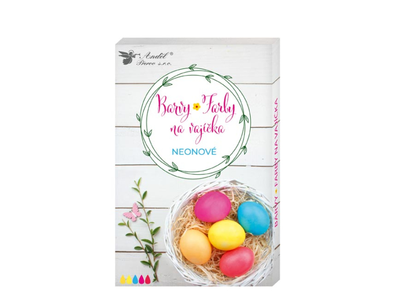 Sada gélových neónových farieb na vajíčka. Krásne žiarivé farby určite upútajú každého koledníka. OBSAH BALENIA: - 5 ks gélových farieb (žltá, oranžová, modrá, červená, ružová) NÁVOD: 1. Vajcia uvarte v osolenej vode. 2. Farby pomocou nožníc oddeľte. Pri požadovanej farbe odstrihnite špičku a nalejte ju do misky. 3. Pridajte 150 ml horúcej vody a 2-3 lyžice octu. 4. Teplé vajcia jedno po druhom namáčajte a prelievajte, kým nebudú mať intenzívnu farbu. Jedna tuba nafarbí 4 – 5 vajíčok. Uvedená cena je za 1 balenie.