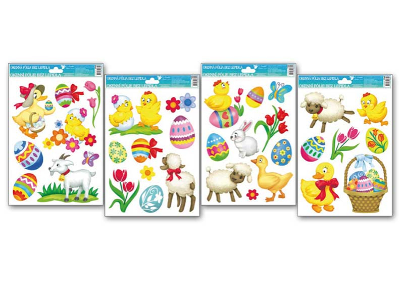 Okenná fólia bez lepidla. Na fólii je 10 obrázkov s veľkonočnými motívmi. Rozmer 30x20 cm. Návod na použitie: Z podložky odlúpnite obrázok, umiestnite ho na čisté, prípadne navlhčené sklo stranou, ktorá bola na podložke. Obrázok elektrostaticky priľne.