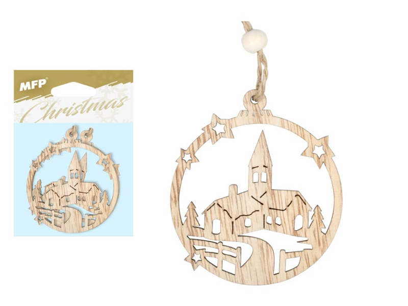 Vianočná drevená dekorácia, 2 ks. V banke je zobrazený vyrezávaný kostol. Ozdoba je opatrená šnúrkou, ktorá slúži na zavesenie. Vyrobené sú z preglejky a z prírodných materiálov. Všetko je zabalené vo vrecúšku so závesom. Rozmery: 65 x 75 x 3 mm