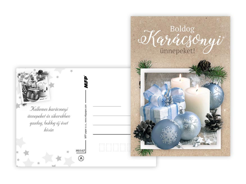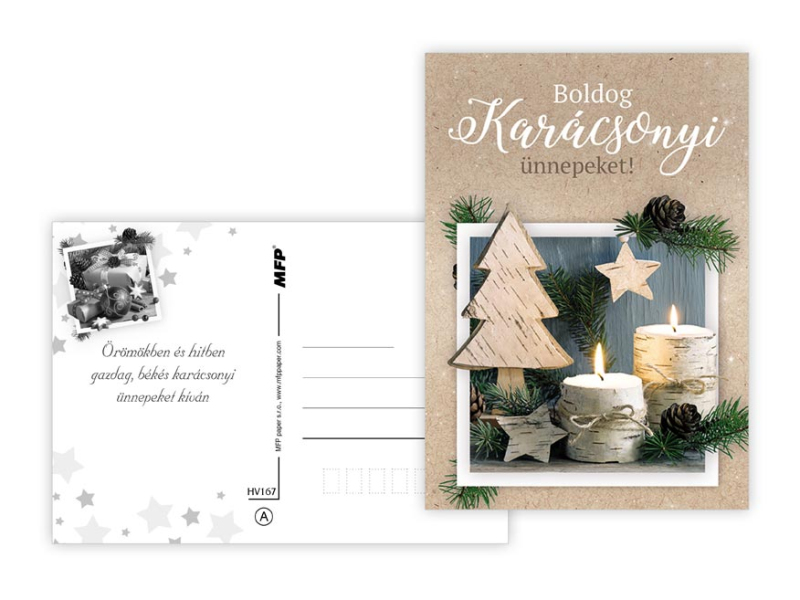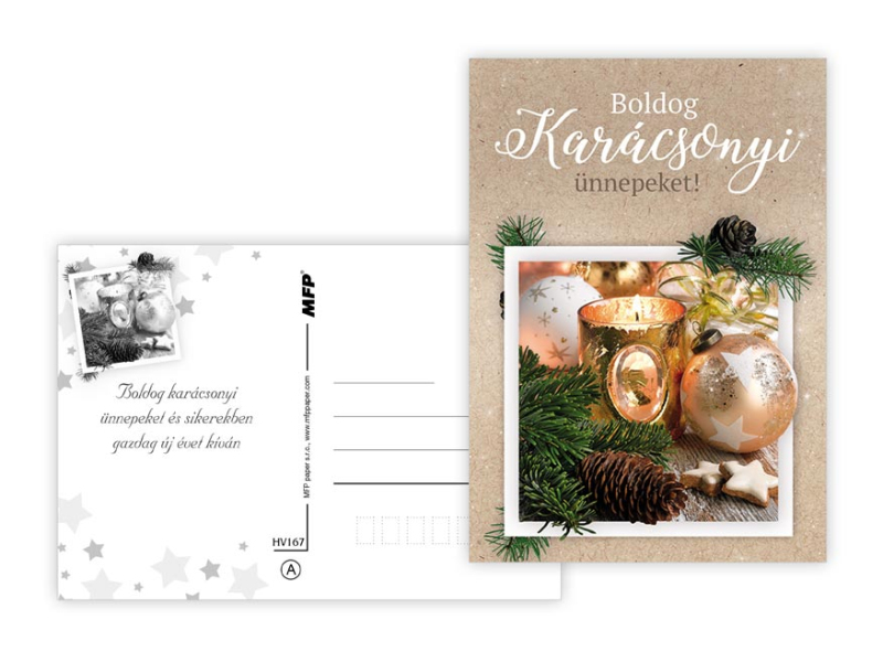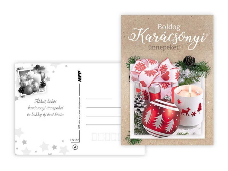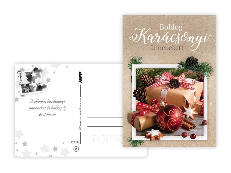 Pohľadnica s vianočným motívom a maďarským textom. Text na zadnej strane obsahuje 6 pohľadníc zo 6. Papier: pohľadnicový kartón 240 g Povrchová úprava: lamino lesk Text: 6/6 Dodávame v mixe po 6 ks podľa skladovej zásoby. Uvedená cena je za 1 ks.
