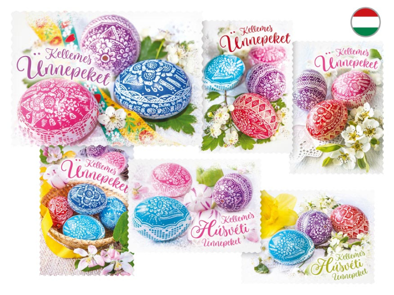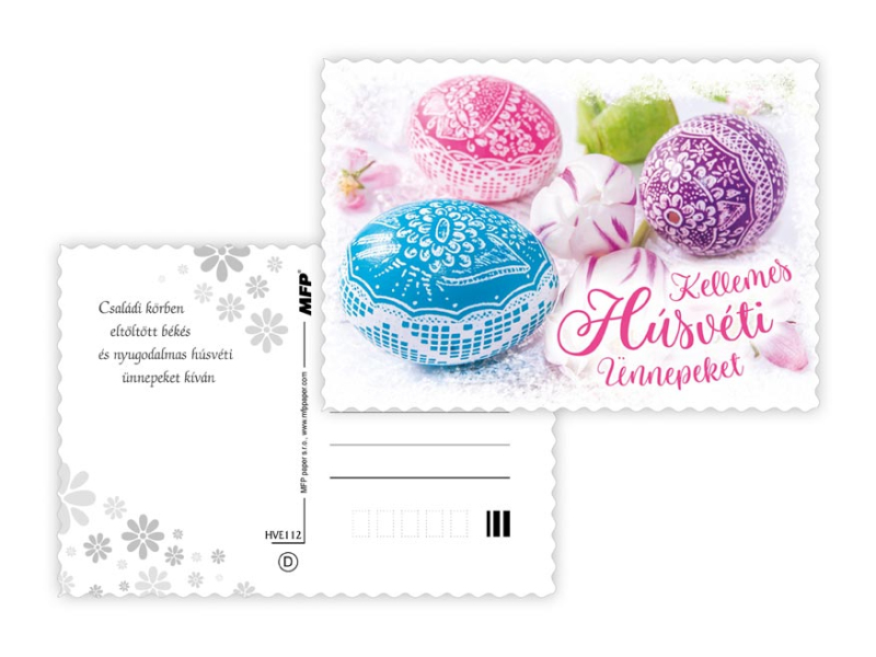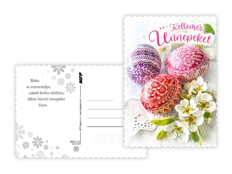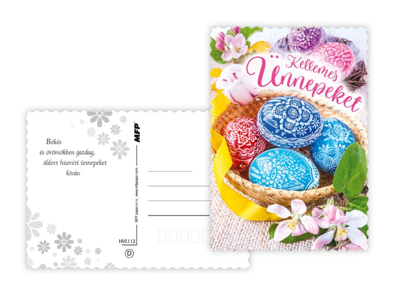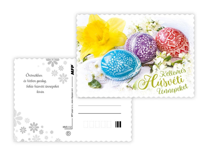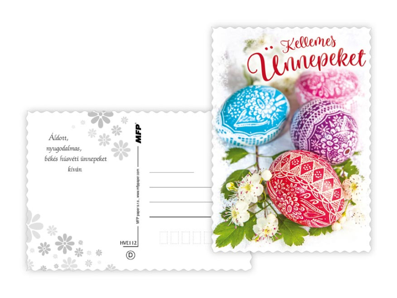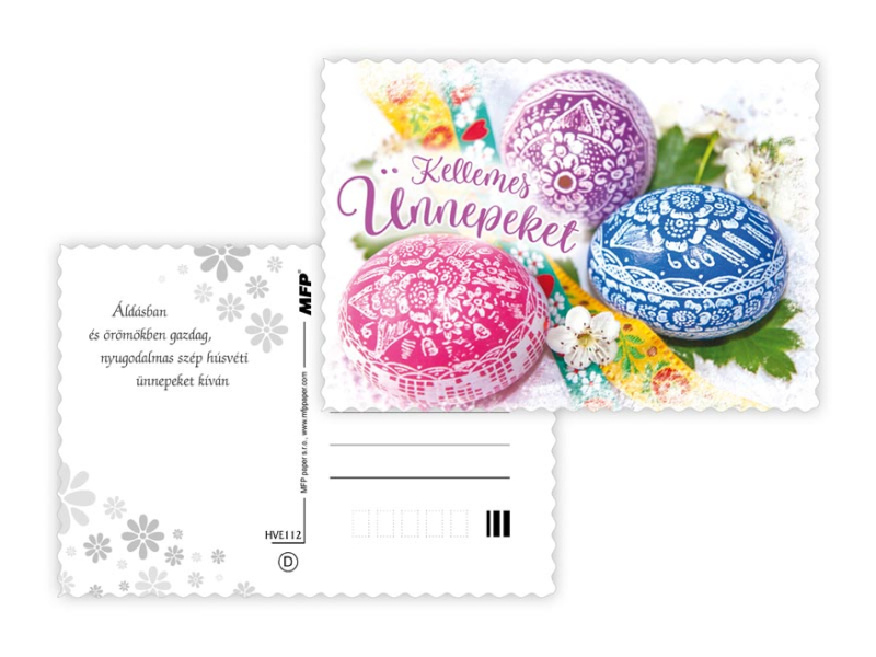 Veľkonočná pohľadnica s maďarským textom. Text na zadnej strane obsahuje 6 pohľadníc zo 6. Papier: pohľadnicový kartón 240 g Povrchová úprava: s výsekom Text: 6/6 Dodáváme v mixu po 6 ks dle skladové zásoby. Uvedená cena je za 1 ks.