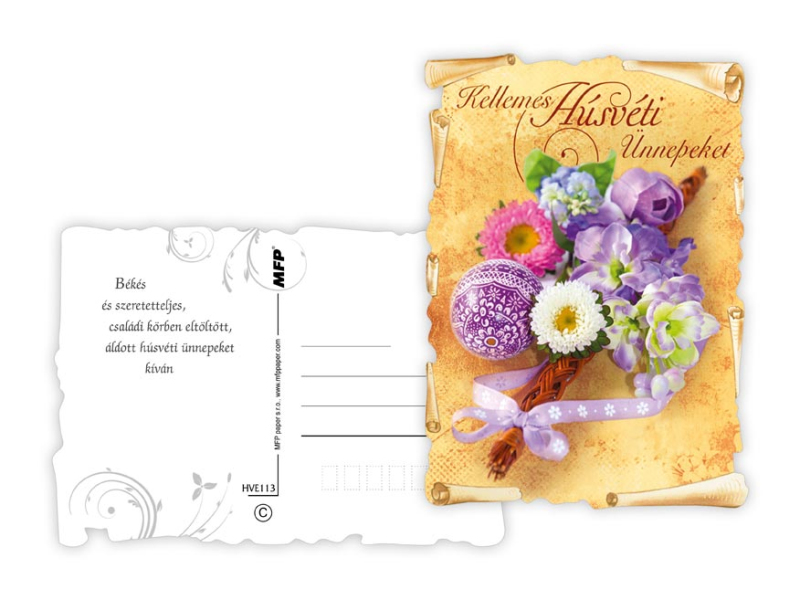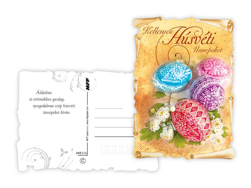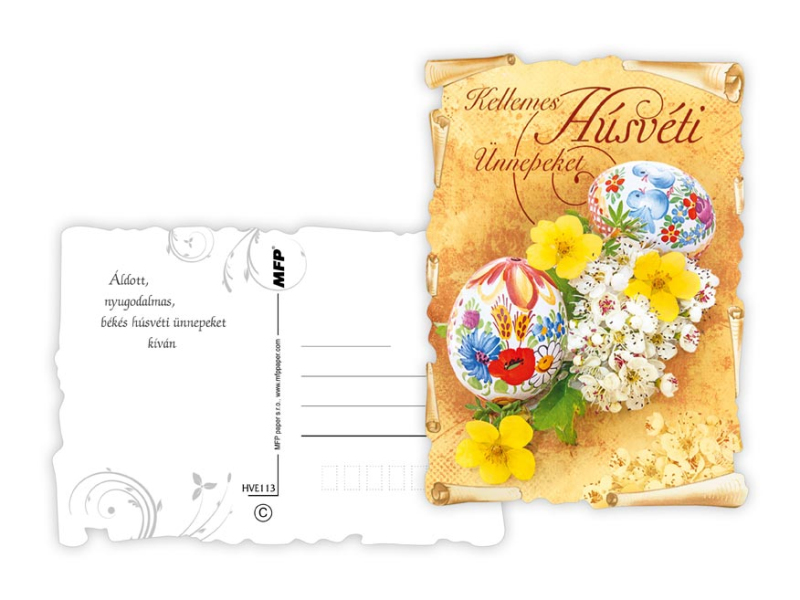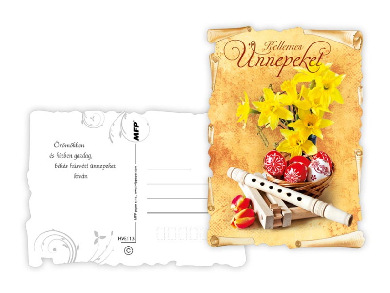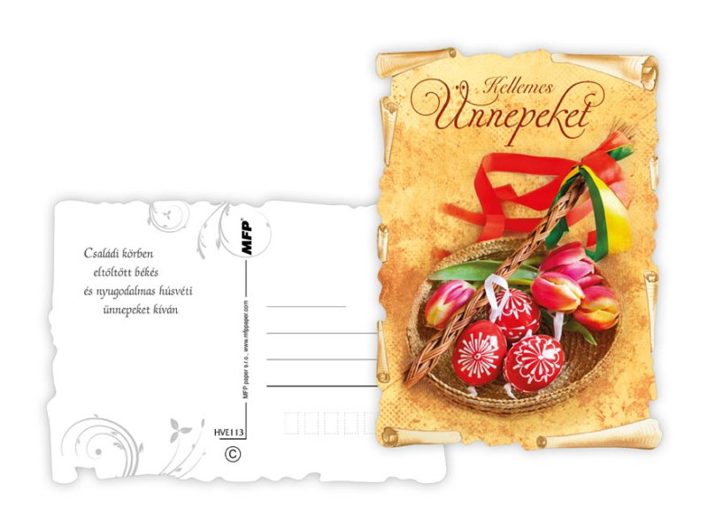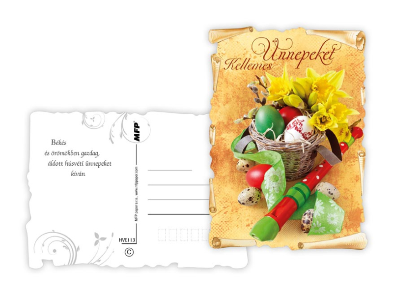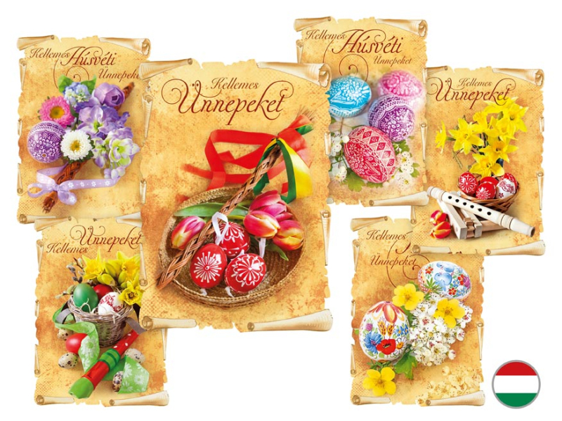 Veľkonočná pohľadnica s maďarským textom. Text na zadnej strane obsahuje 6 pohľadníc zo 6. Papier: pohľadnicový kartón 240 g Povrchová úprava: s výsekom Text: 6/6 Dodáváme v mixu po 6 ks dle skladové zásoby. Uvedená cena je za 1 ks.