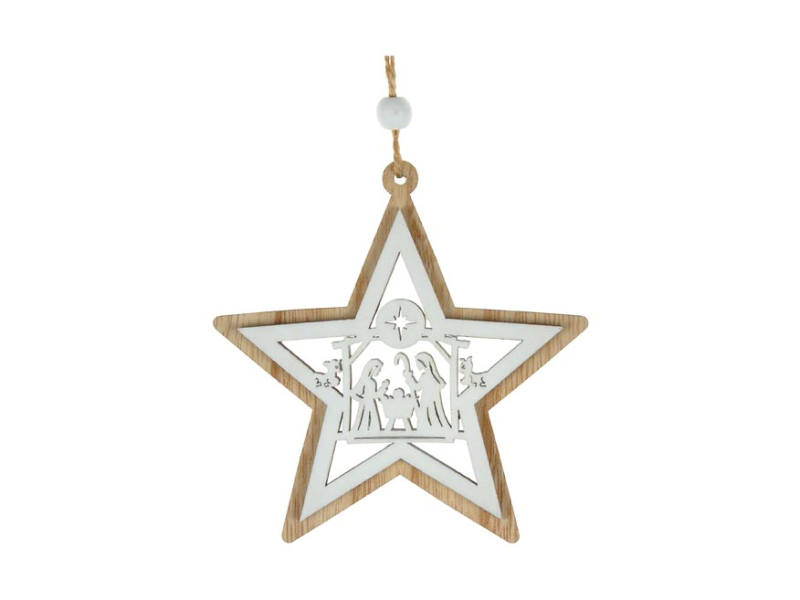 Drevená vianočná dekorácia v tvare hviezdy. Uprostred hviezdy je vyobrazenie Ježiška v kolíske.