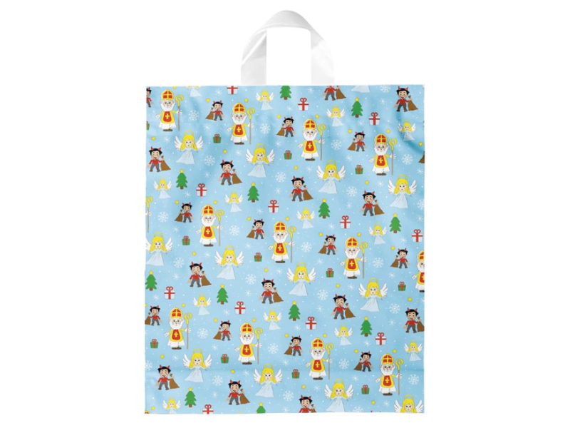 Celoplošne potlačená plastová taška s mikulášskym motívom a zváranou rukoväťou. Na taške sú obrázky Mikuláša, anjela, čerta a vianočných darčekov. Hrúbka plastovej tašky: 0,050 mm Uvedená cena je za 1 ks.